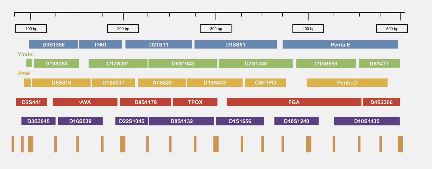 ? 六色熒光技術,復合擴增30個常染色體基因座,1個性別基因座 Amelogenin和1個性別輔助判斷 基因座Yindel;